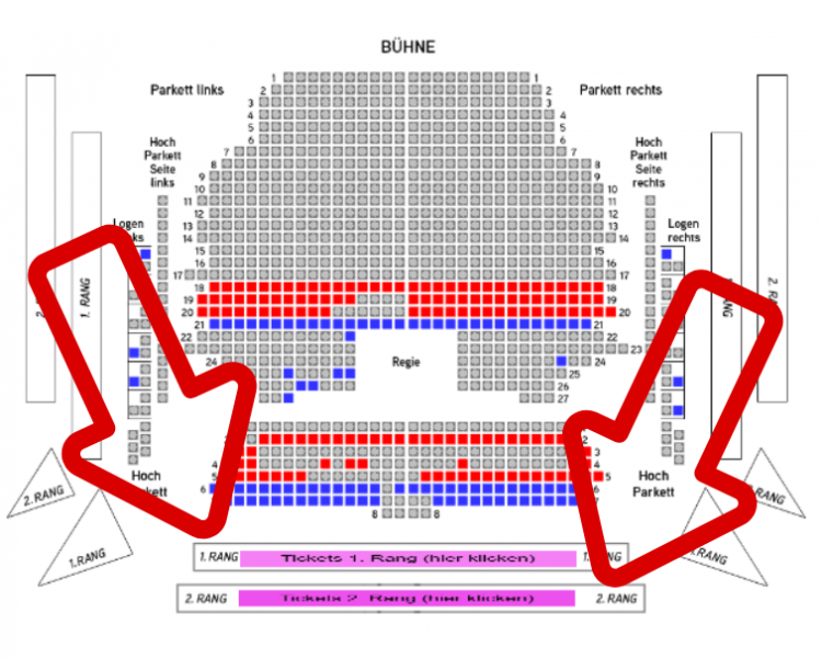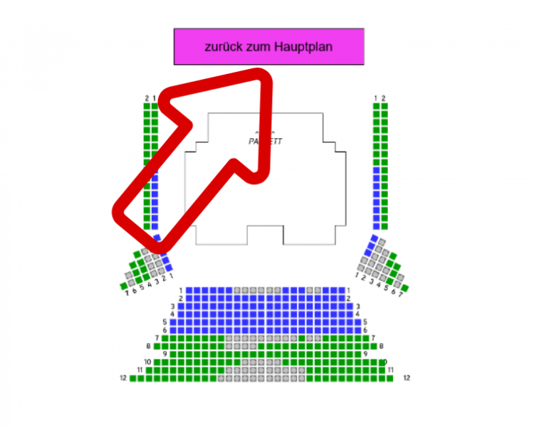 Bitte klicken Sie im Hauptplan (=Parkett/Hochparkett) die höher gelegene Ebene 1. Rang oder 2. Rang an: